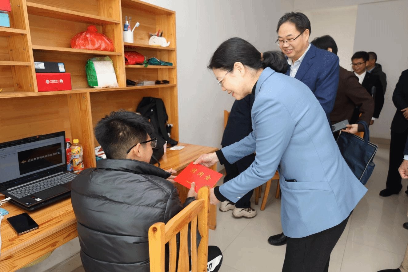 在学生住处,饶冬梅与刘宏基和江子强同学及其陪读家长深入交流,细心询问他们的学习生活、身体状况和实际困难,对家长们的陪伴与辛勤付出表示慰问,并送上慰问金。饶冬梅充分肯定了残疾学生克服身体障碍、刻苦求学的坚强意志以及困难残疾人家庭子女在逆境中奋发前行、勇担家庭希望的宝贵精神。她指出,每一位残疾青年和残疾人家庭子女都是国家的未来和希望,他们的成长成才是残疾人事业全面发展、社会文明进步的重要体现。她勉励同学们以全国自强模范为榜样,将自强不息的精神力量转化为刻苦学习、锤炼本领、回馈社会的实际行动。