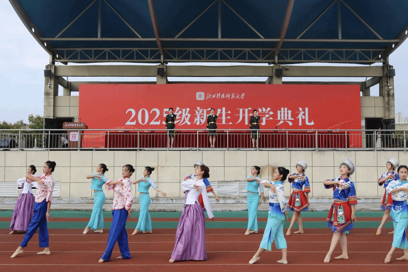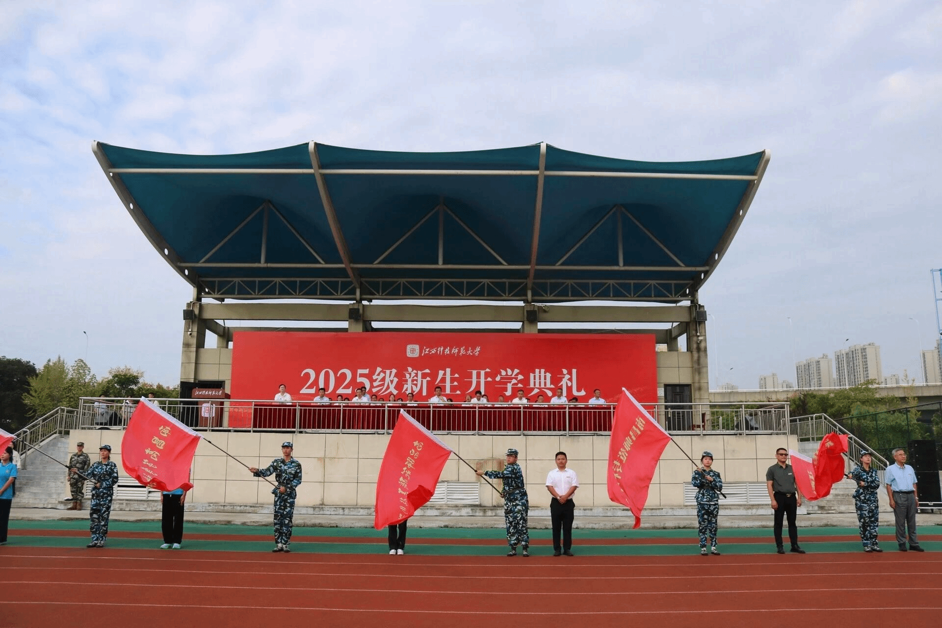 典礼前的暖场节目让现场气氛既温馨又热烈。“青春告白”成长信箱封存仪式上,同学们将写有自己设定的人生目标、对未来自己的寄语、大学四年生活规划的信投入信箱并统一封存,相约四年后共同见证每一个梦想的绽放。情景诗朗诵《可爱的中国》激情澎湃,表达了对祖国母亲深深的热爱与敬仰。《我的英雄我的城》《红歌联唱》等歌舞表演气势磅礴,唱出师生坚定不移听党话、跟党走的决心与信念。情景剧“大学生活开机”为新生贴心解答学习生活各种困惑,引导他们更好地融入大学生活。随后举行了庄重的授旗仪式。校友、老生代表将学校不同时期的校名旗,郑重授予2025级新生代表。这场特殊的授旗仪式旨在传承学校历史文化,让新生感受学校精神脉络,激发归属感与使命感,开启崭新学习征程。
