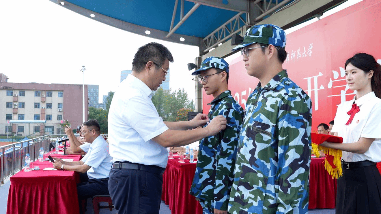 裴鸿卫为新生代表佩戴校徽。这枚校徽,是“科技师大人”身份的象征,更是“明德精业”校训精神的载体。胸前闪耀的徽章,激励着同学们心怀梦想、奋发图强,书写无愧于时代的青春篇章。